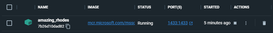 docker run -e "ACCEPT_EULA=Y" -e "MSSQL_SA_PASSWORD=MsSql!123" -e "MSSQL_PID=Express" -p 1433:1433 -d mcr.microsoft.com/mssql/server:2019-latest