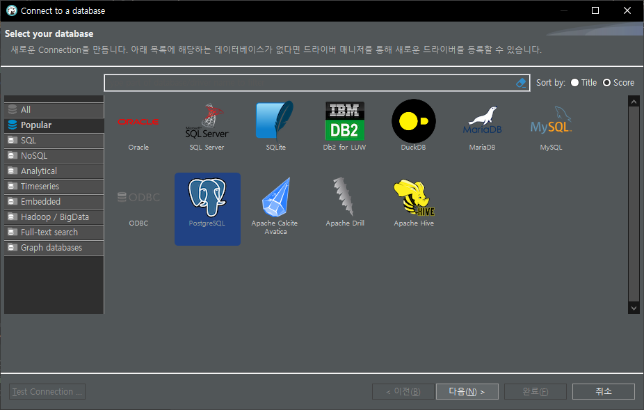 2. DB 선택화면에서 PostgreSQL을 선택하고 '다음' 버튼을 누릅니다.