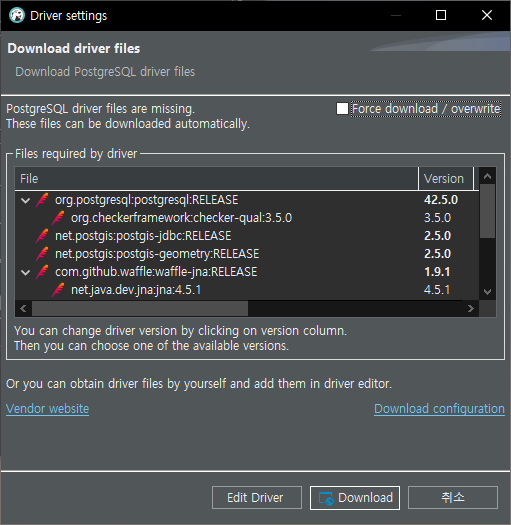 4. 화면 좌측 하단의 "Test Connection..." 버튼을 눌렀을 때, 만약에 처음 PostgreSQL에 연결하는 것이라면 아래와 같은 드라이버 설치 화면이 나타납니다. 화면 하단의 Download 버튼을 누르시면 드라이버가 설치됩니다.