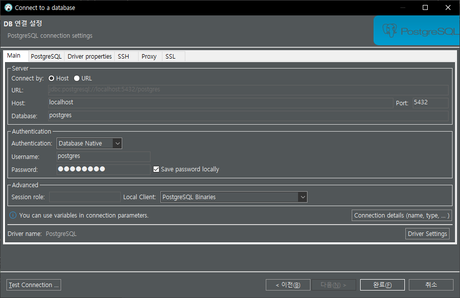 3. PostgreSQL에 연결하기 위한 설정값을 입력합니다.