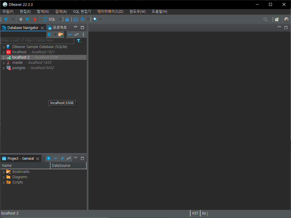 5. DB에 정상적으로 연결되는 것을 확인했으므로 '완료' 버튼을 눌러 연결 설정을 완료합니다. 화면 좌측 "Database Navigator" 아래에 'localhost 2'라는 이름을 추가된 것을 확인하실 수 있습니다.