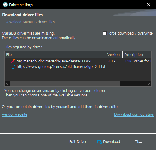 4. 화면 좌측 하단의 "Test Connection..." 버튼을 눌렀을 때, 만약에 처음 MariaDB에 연결하는 것이라면 아래와 같은 드라이버 설치 화면이 나타납니다. 화면 하단의 Download 버튼을 누르시면 드라이버가 설치됩니다.