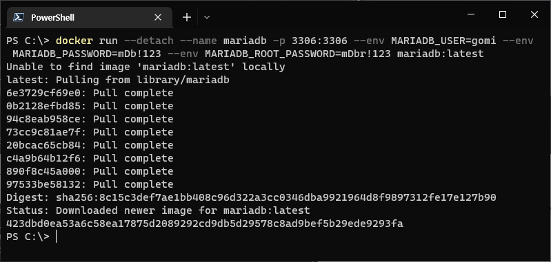 docker run --detach --name mariadb -p 3306:3306 --env MARIADB_USER=gomi --env MARIADB_PASSWORD=mDb!123 --env MARIADB_ROOT_PASSWORD=mDbr!123 mariadb:latest