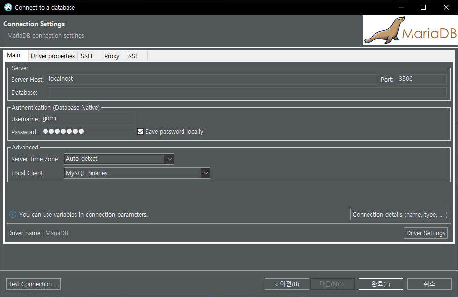 3. MariaDB 에 연결하기 위한 설정값을 입력합니다.