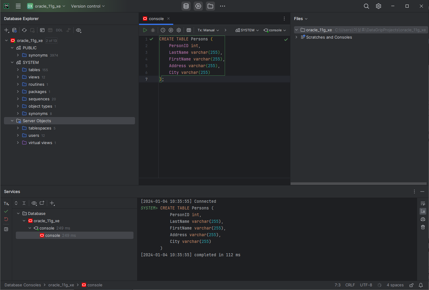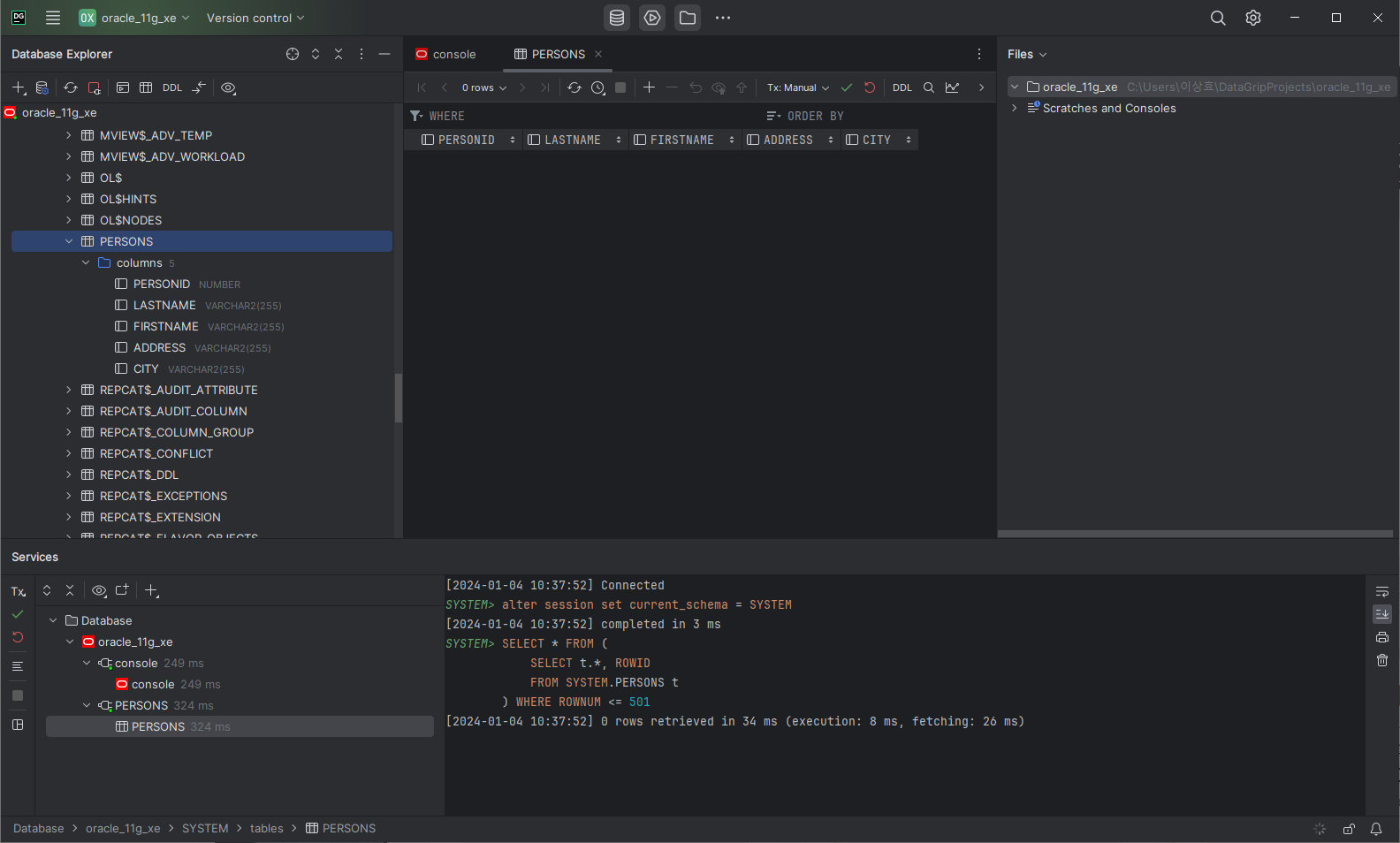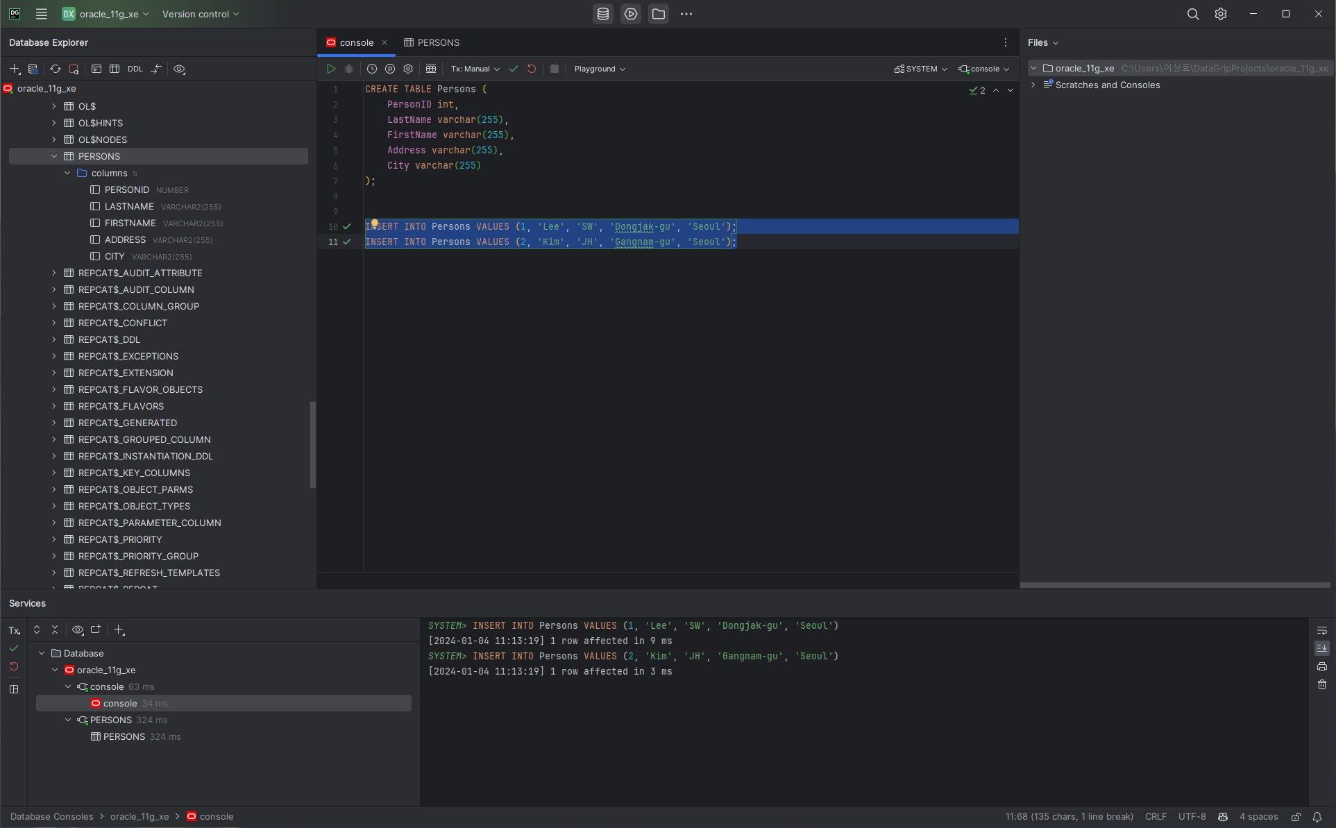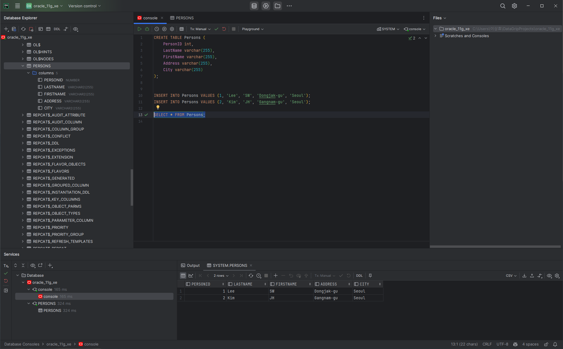 | Oracle SQL Developer 에서 Oracle DB XE 11g에 테이블 생성하고 데이터 입력하기 (0) | 2023.01.21 |
