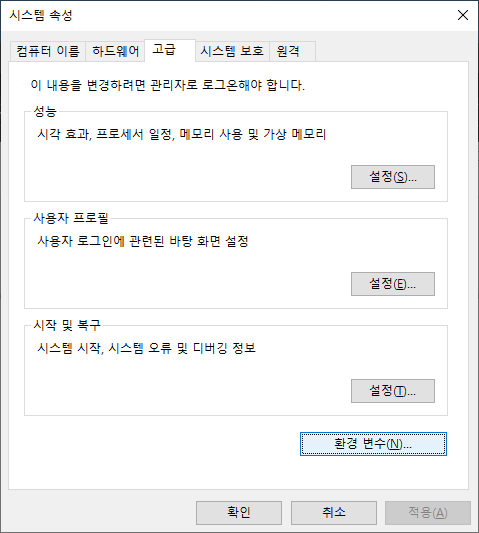아래와 같은 창이 나오면 '고급' 탭 하단의 '환경 변수'를 클릭하시기 바랍니다.
