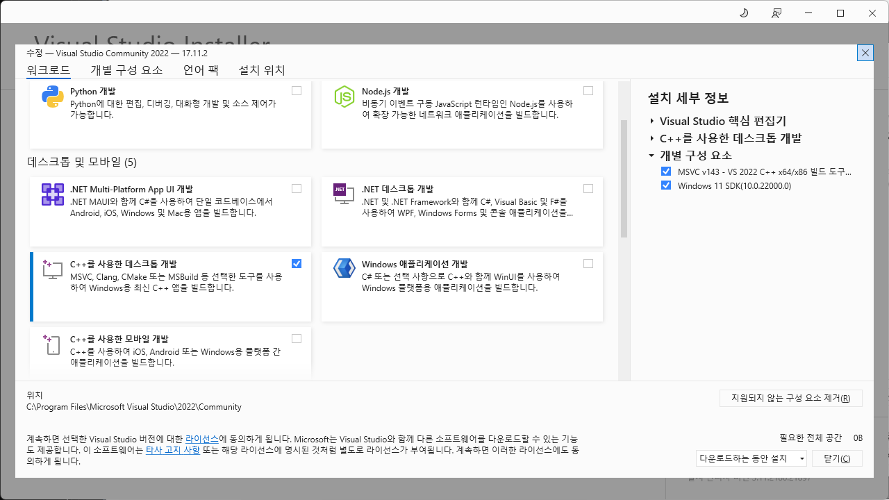 Visual Studio Installer를 실행하여 'C++를 사용한 데스크톱 개발'을 선택하고 설치합니다.