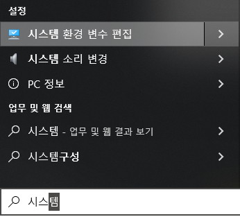 윈도우 버튼을 누르고 '시스템' 단어를 입력하시면 '시스템 환경 변수 편집'을 확인하실 수 있습니다.