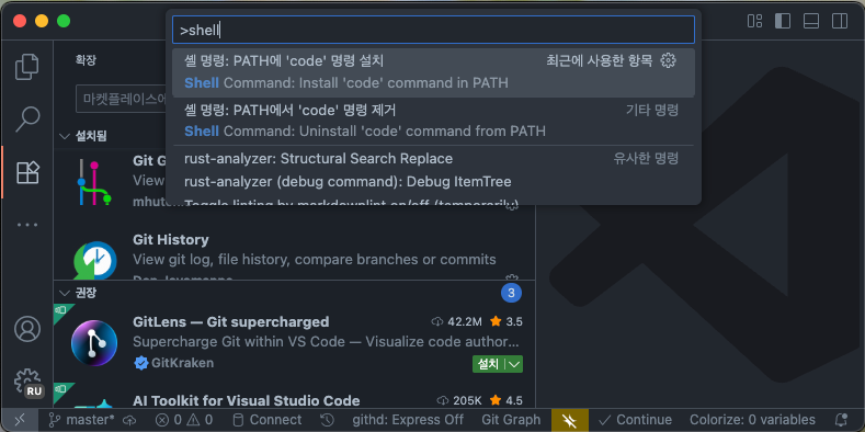 - Shell Command: Install 'code' command in PATH 항목을 선택합니다.