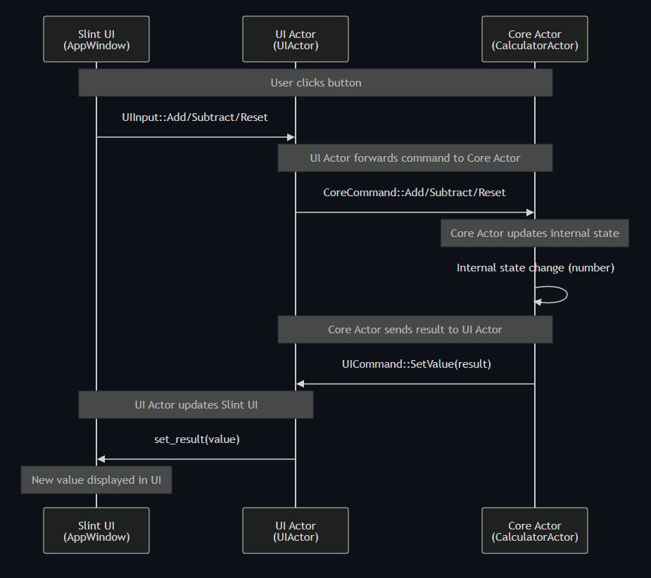 - UI Actor는 Slint UI로부터 받은 메세지를 Core Actor에 전달합니다.