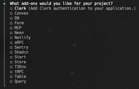 필요한 애드온은 프로젝트 목적에 따라 다릅니다. 예를 들어, 인증이 필요하면 Clerk, 데이터 저장이 필요하면 DB/Neon, 에러 모니터링은 Sentry, 타입 안전 API는 oRPC 또는 tRPC, UI 컴포넌트는 Shadcn, 상태 관리는 Store에 선택하면 됩니다. 배포는 Netlify가 편리합니다. 폼 입력이 많다면 Form을 고려하세요.