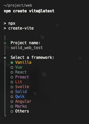 - "--framework Solid"는 React 대신 Solid라는 UI 프레임워크를 사용하겠다는 옵션입니다.