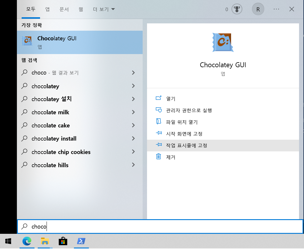 윈도우 버튼을 누른 후 Chocolatey를 차례로 입력하다 보면 아래와 같은 프로그램이 나옵니다.