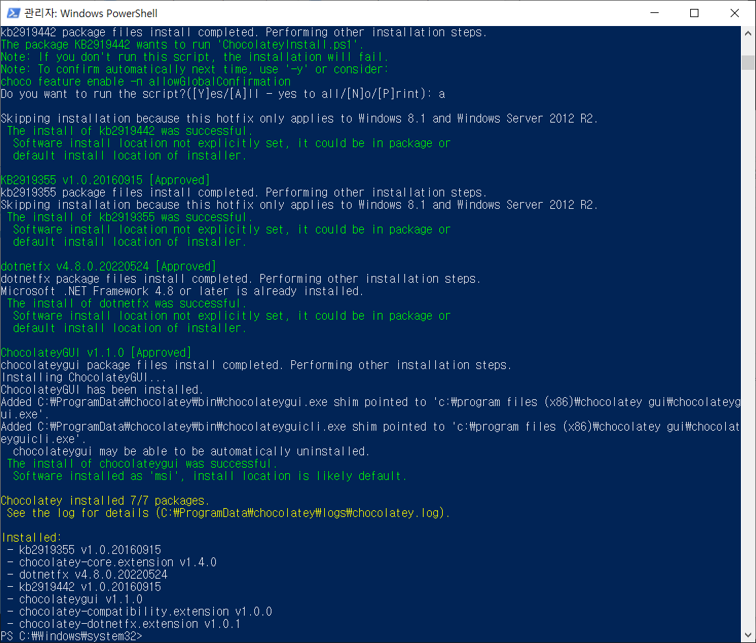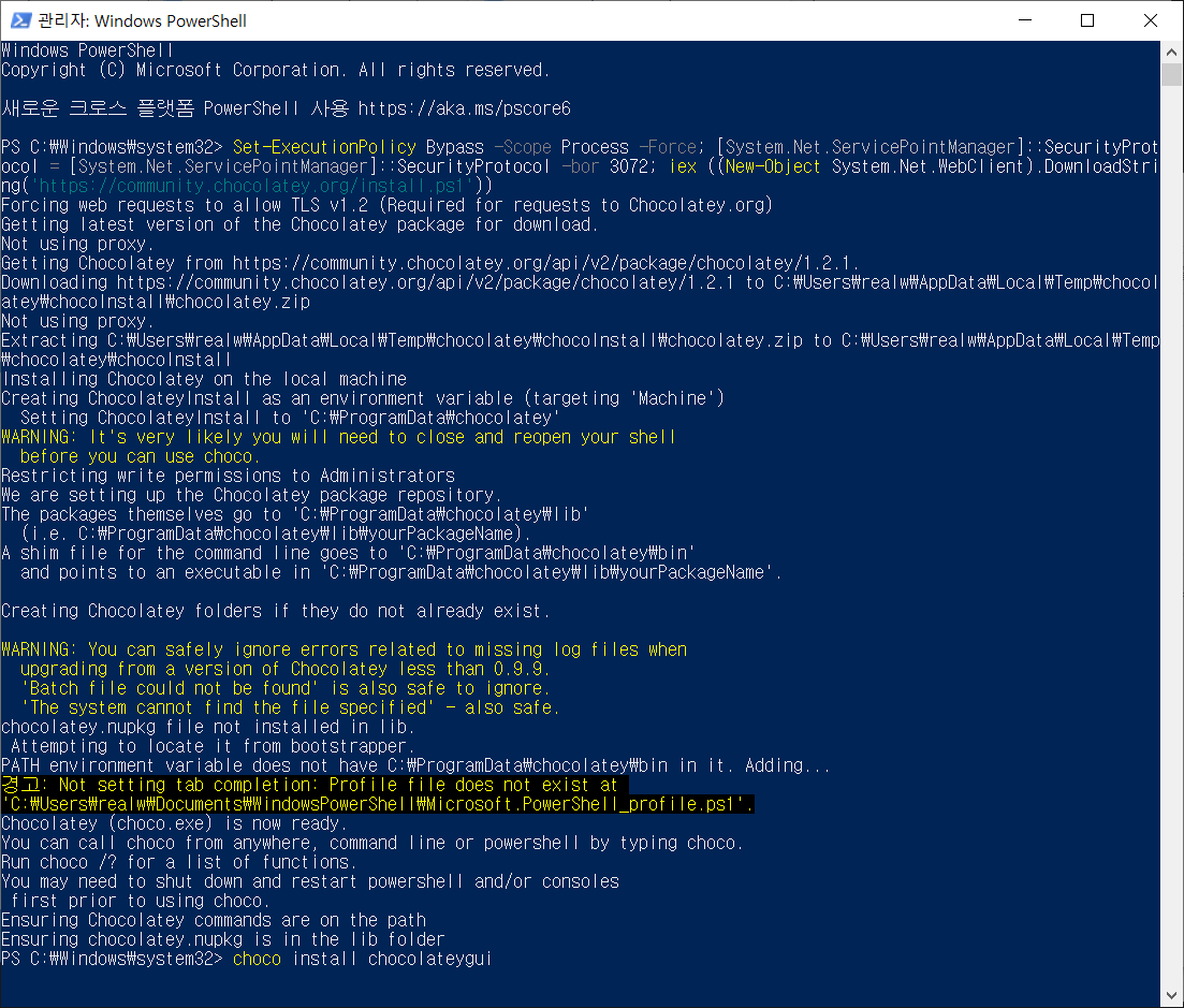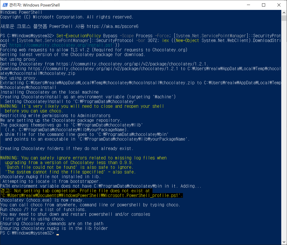 여기까지 Chocolatey 설치를 완료하였습니다.
