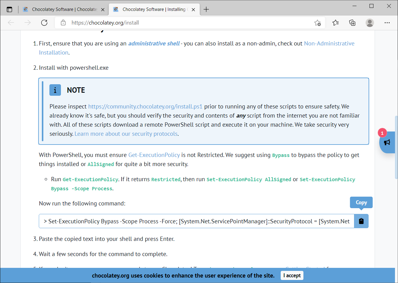 1. Chocolatey 설치 안내 화면( https://chocolatey.org/install )을 보시면 화면 중간쯤에서 아래와 같은 화면을 보실 수 있습니다. 이 화면 우측의 복사 버튼을 눌러 설치 명령을 복사합니다.