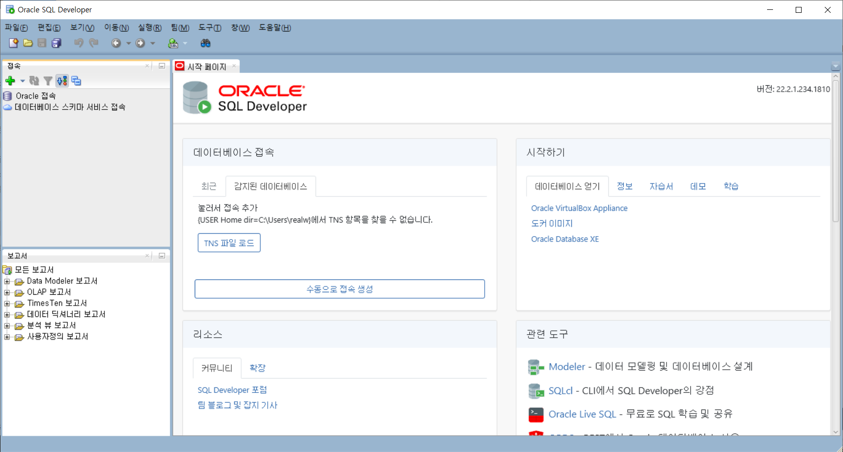 3. sqldeveloper 를 실행합니다. 처음 실행하면 아래와 같은 화면을 보실 수 있는데 '아니오'를 선택하시면 됩니다.