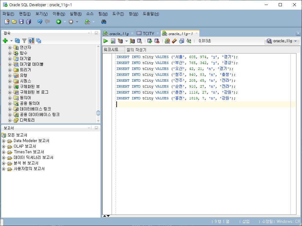 INSERT INTO tCity VALUES ('서울', 605, 974, 'y', '경기');
