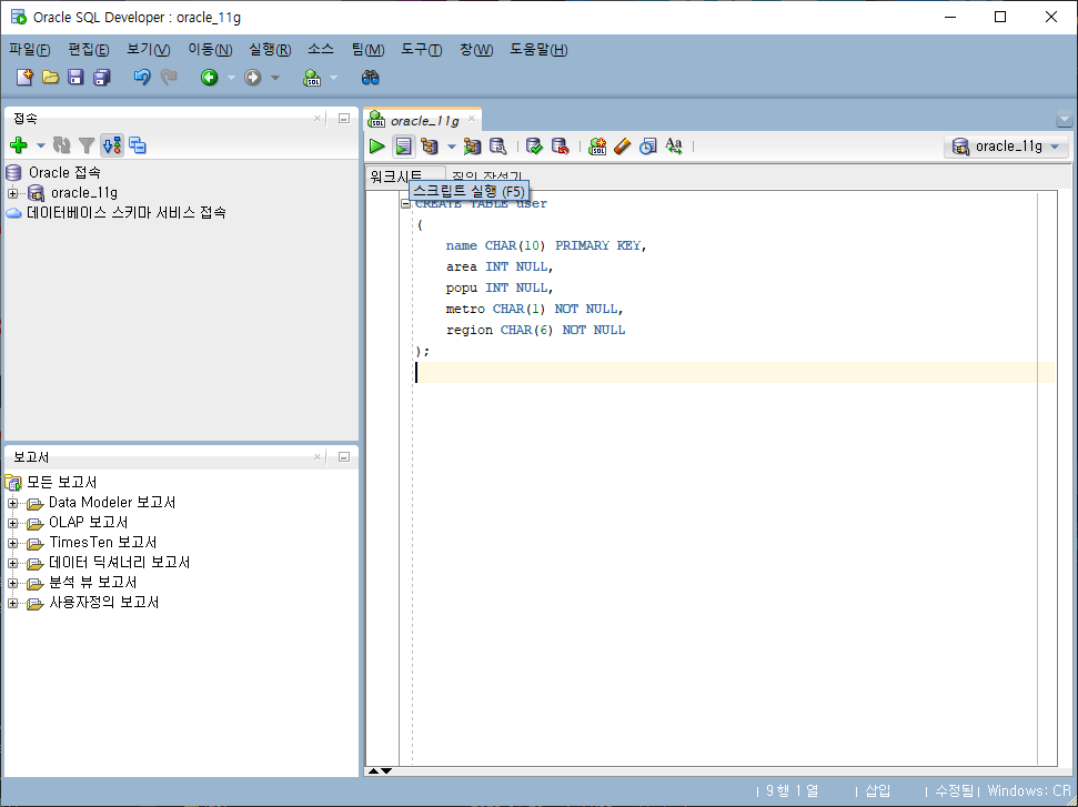 4. 아래의 테이블 생성 명령을 워크시트에 넣고 F5 키를 눌러 실행해봅니다.