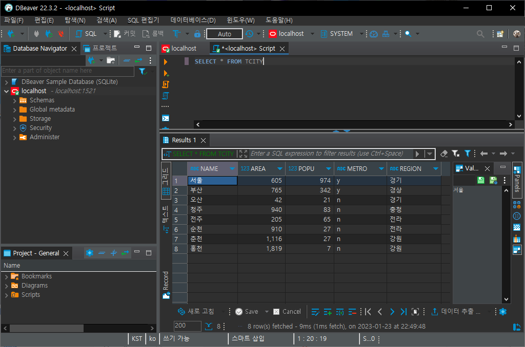8. 이전 게시물( https://blog.cellaxon.com/8 )에서 tCity 테이블을 입력하셨다면, 아래의 명령을 입력하고 Ctrl + Enter를 눌러서 한 번 실행해보겠습니다.
