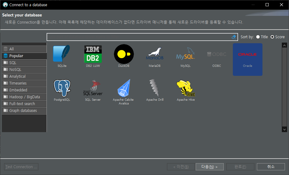 2. 데이터베이스를 선택하는 화면입니다. Oracle DB를 연결할 것이므로 Oracle을 선택했습니다.