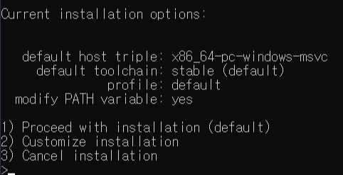 다운로드 받으신 rustup-init.exe 파일을 실행하시면 설치를 시작합니다.
