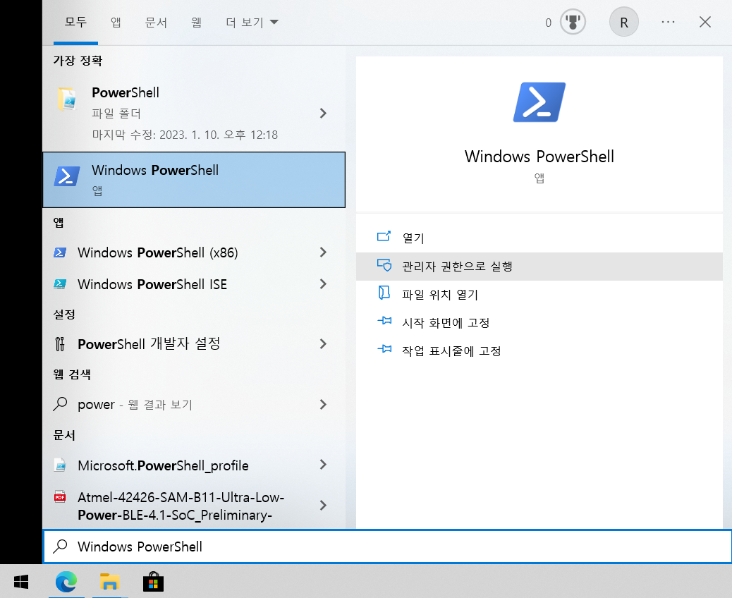 2. Windows 버튼을 누른 후 'PowerShell'을 키보드로 누르다 보면 아래와 같은 화면이 나옵니다. 이 화면 우측에 '관리자 권한으로 실행'을 누르시면 Windows PowerShell이 관리자 권한으로 실행됩니다.