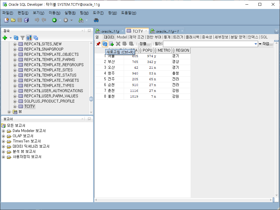 3. TCITY 테이블을 열고, '데이터' 탭을 클릭하여 선택한 후, '데이터' 탭 아래에 있는 '새로고침' 버튼을 누르세요. 아래와 같이 입력한 데이터를 확인하실 수 있습니다.